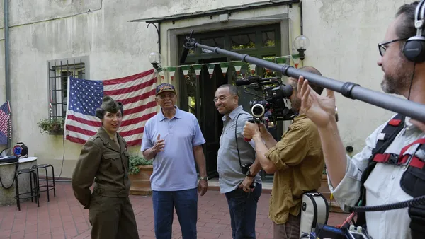At the 500-year-old Villa La Dogana, Mattea Piazzesi, Ivan J. Houston, and Ivan A. Houston are filmed for With One Tied Hand, the Buffalo Soldiers of WWII. Guido Frenzel (DP) and Daniel S. McCoy (Sound) are shown in this BTS photo.